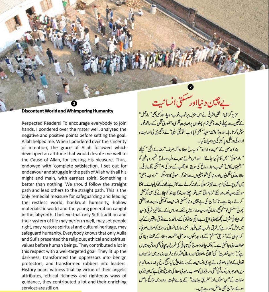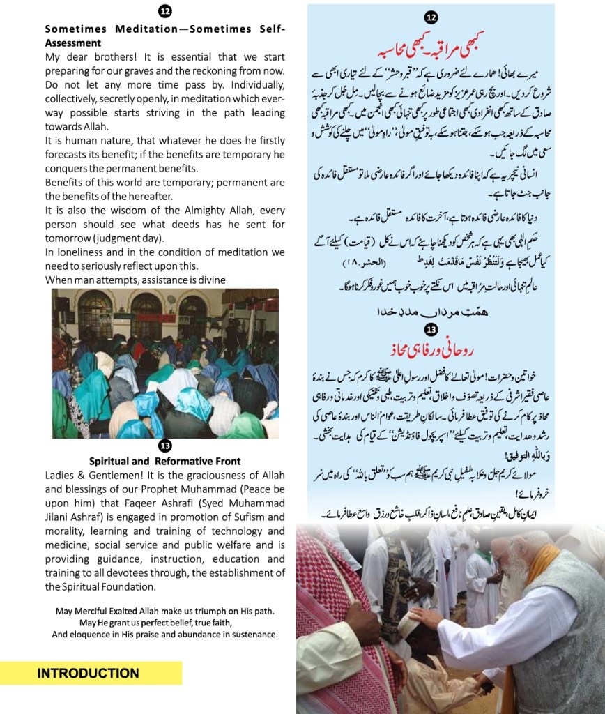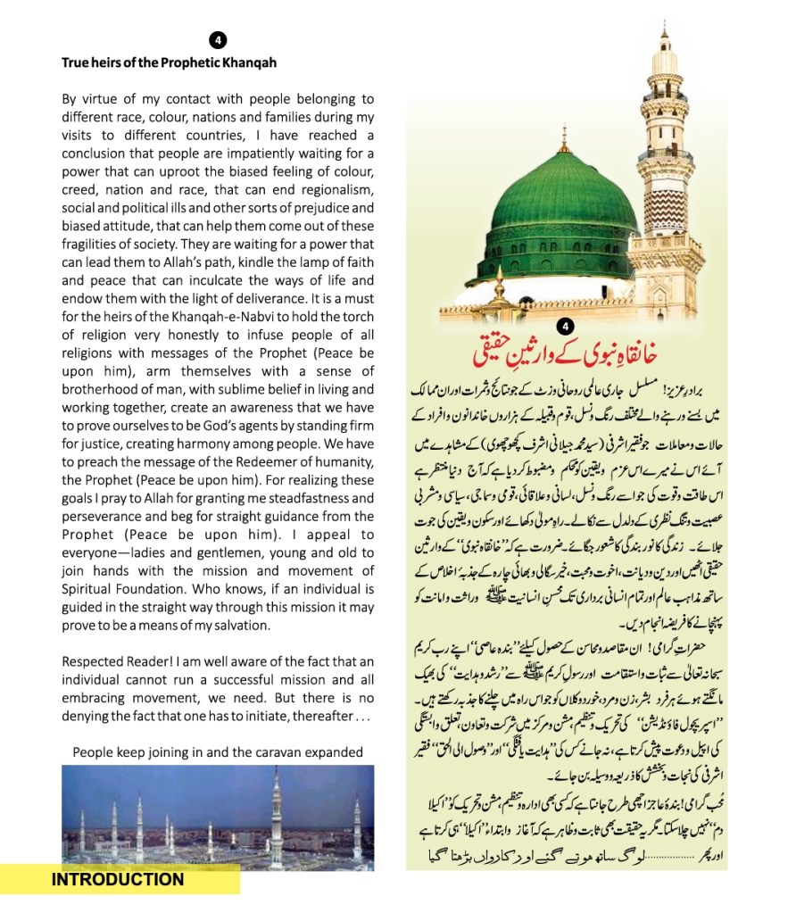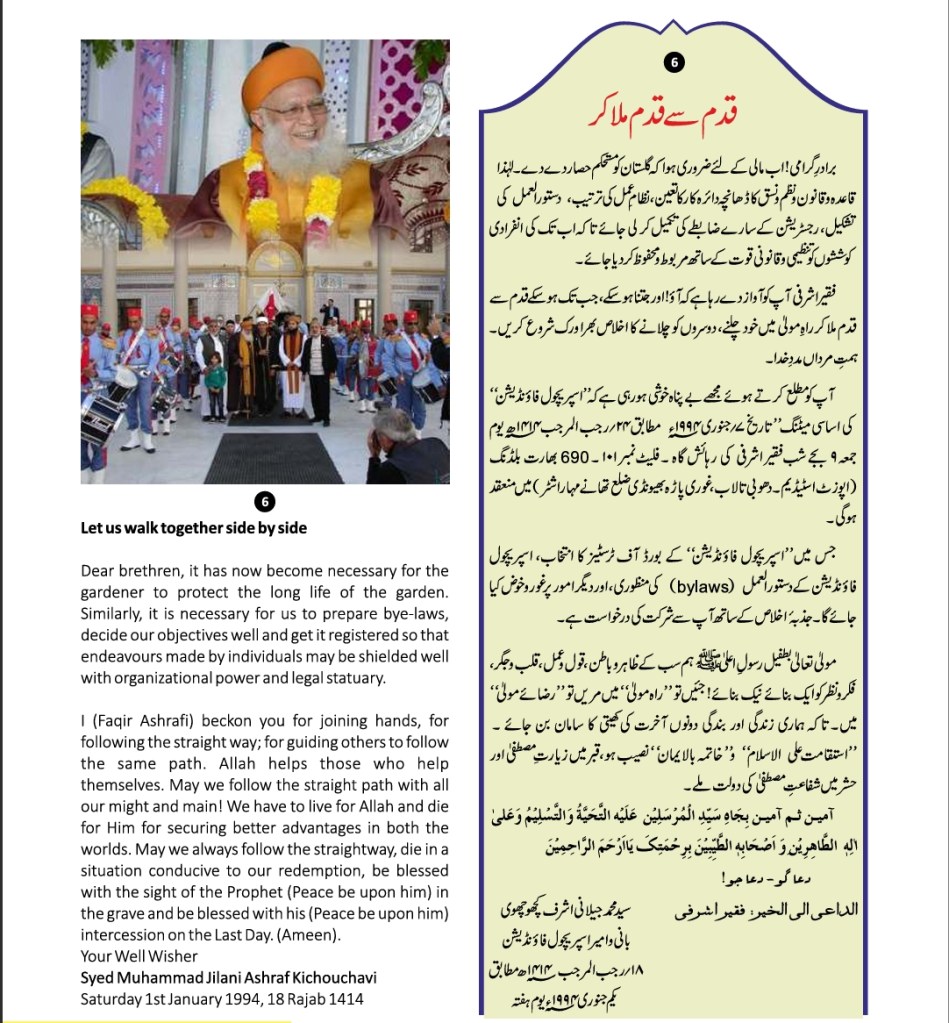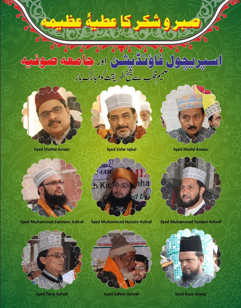 All praises are due to Almighty Allah that He provided, Faqir Ashrafi Syed Muhammad Jilani Ashraf Bin Syed Muhamid Ashraf Ashrafi Al-Jilani Kichouchavi (settled in A/451, Indira Nagar, Lucknow, U.P.) with an opportunity to dedicate 28 years of his life to religious activities-propagation, establishing religious institutions, taking corrective and constructive measures for guiding people, founding organizations, teaching at religious institutions, engaging himself in academic works, Peeri Mureedi (administering oath of allegiance) journalistic engagements, and a host of other social and economic services.