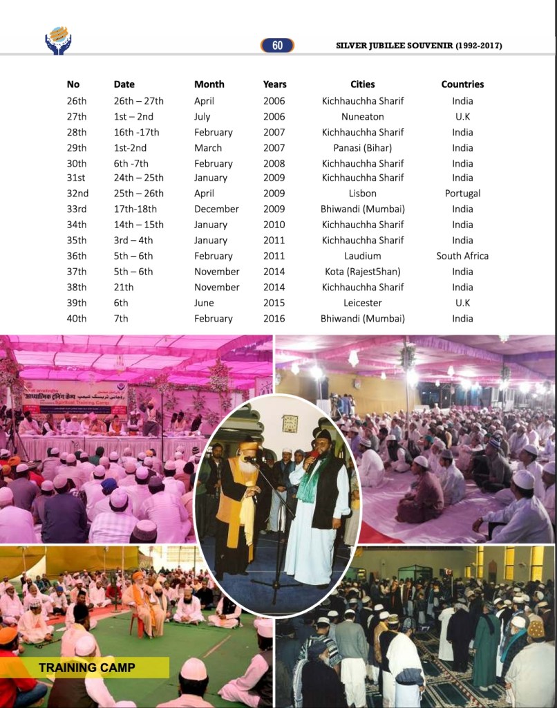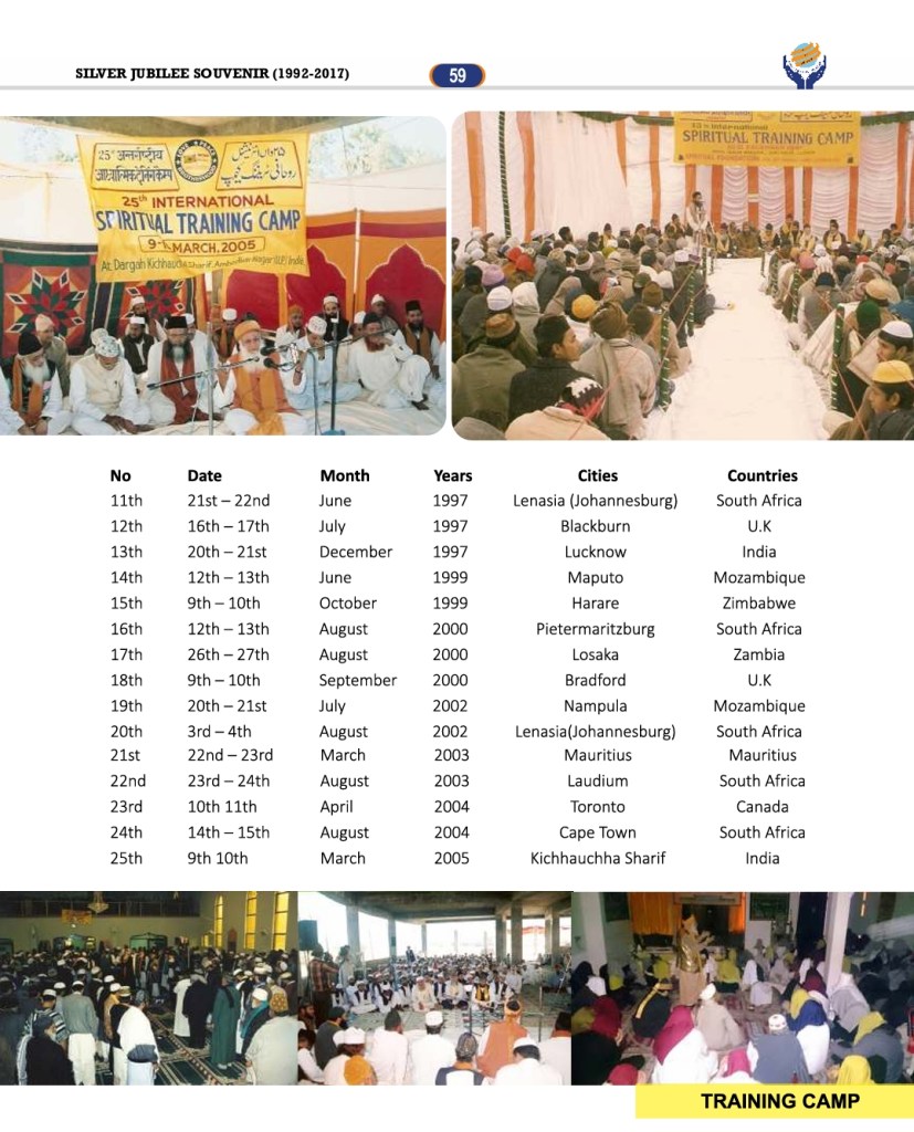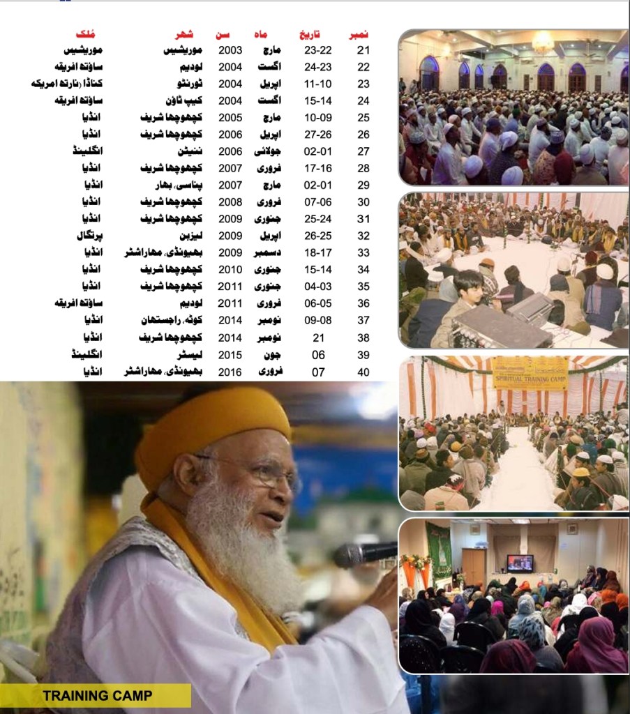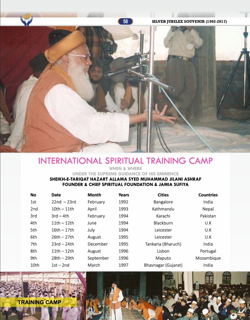 Sheikh-e-Tariqat, Hazrat Allama Syed Muhammad Jilani Ashraf, has been organizing International Spiritual Training Camps for several decades. These camps focus on spiritual guidance, personal transformation, and self-purification while also incorporating medical camps and retreat programs for holistic well-being.